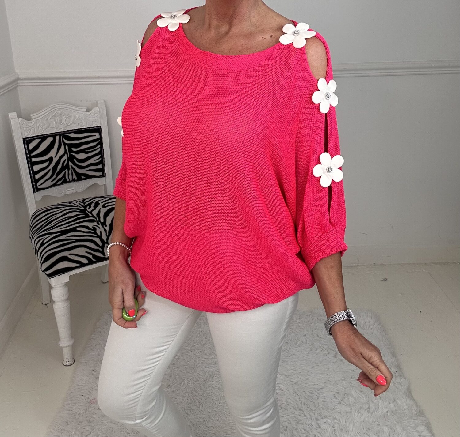 HOT PINK FLOWER COLD CHOULDER JUMPER